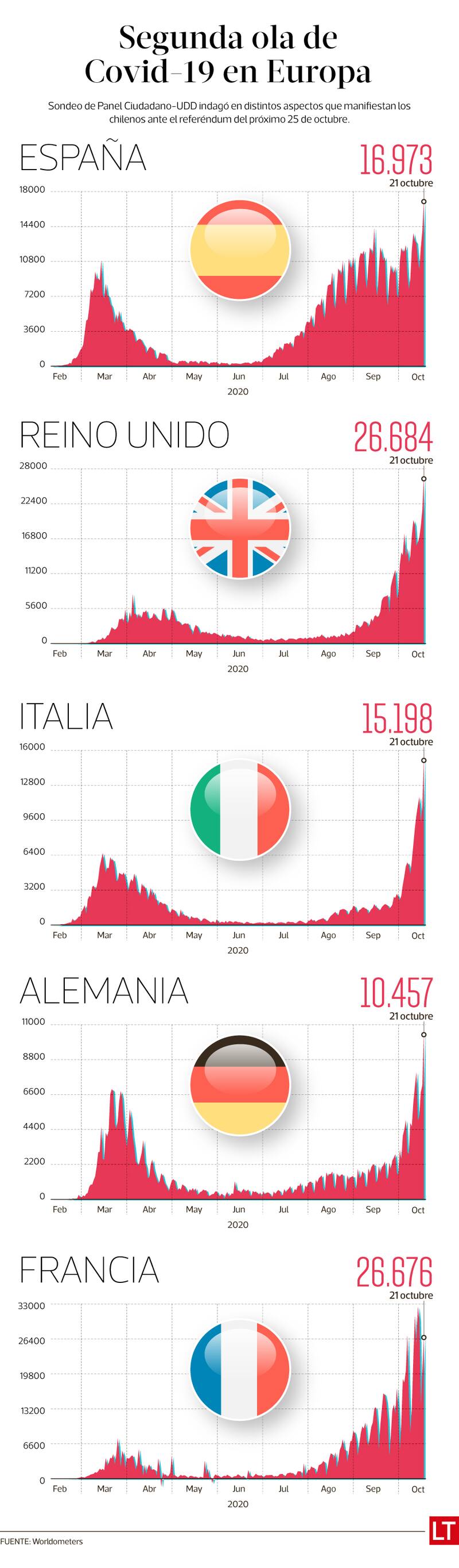 Francia amplió el toque de queda a otros 38 departamentos, mientras España no ha logrado acuerdo general para la medida, pero algunas comunidades han decidido avanzar en esta restricción. Reino Unido, en tanto, anunció un plan de apoyo a los trabajadores afectados.