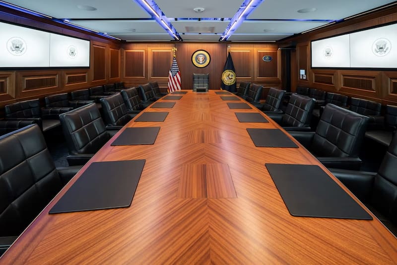 Trump estaba en su lugar habitual, en la cabecera de la mesa. A su derecha se sentaba el vicepresidente; junto a Vance estaba Wiles, luego Ratcliffe, después el abogado de la Casa Blanca, David Warrington, y luego Steven Cheung, el director de comunicaciones de la Casa Blanca. Frente a Cheung estaba Karoline Leavitt, la secretaria de prensa de la Casa Blanca; a su derecha estaba el general Caine, y luego Hegseth y Rubio.