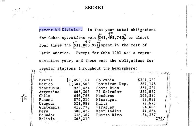 Claro que en ese ranking no figura Cuba, que acaparaba por lejos los recursos de la inteligencia estadounidense en la región. “Ese año, las obligaciones totales para las operaciones cubanas fueron de US$41.498.743, o casi cuatro veces los US$ 11.003.991 gastados en el resto de América Latina”.