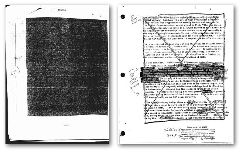 Un memorando expuesto en la reciente publicación, en tanto, revela que para enero de 1961, el mes en que JFK asume la presidencia, “el 47% de los oficiales políticos que servían en las embajadas de Estados Unidos eran CAS”, es decir, agentes de inteligencia que trabajaban bajo apariencia diplomática conocidos como Fuentes Estadounidenses Controladas, según informó el ayudante de la Casa Blanca, Arthur Schlesinger Jr., en un memorando Top Secret sobre “Reorganización de la CIA”. En el caso de Chile, según el documento, 11 de los 13 “funcionarios políticos” de la embajada de EE.UU. en Santiago eran agentes encubiertos de la CIA.