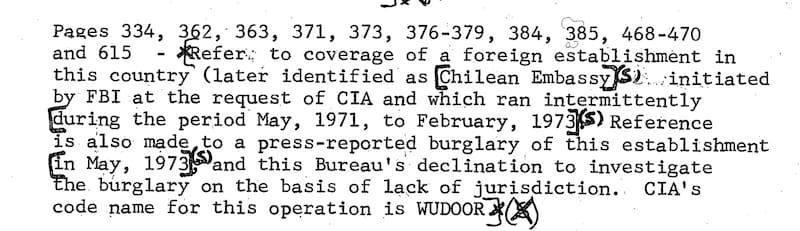 Peter Kornbluh, analista especializado en Chile del Archivo de Seguridad Nacional estadounidense, con sede en la Universidad de George Washington, proporcionó a La Tercera documentos que detallan lo que la CIA denominó “Operación WUDOOR”, un esfuerzo conjunto de la Agencia Central de Inteligencia y el FBI para instalar dispositivos de escucha en la Embajada de Chile en Washington, tras la investidura del presidente socialista Salvador Allende en 1970.