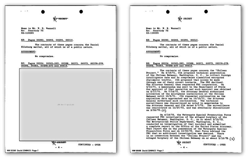 El informe del FBI cita 15 páginas de la compilación original “Joyas de la Familia”, que detallan una infiltración de la CIA y el FBI en la Embajada en 1971 para instalar dispositivos de escucha y un posterior allanamiento, presumiblemente para reemplazarlos o retirarlos. Las referencias a “Joyas de la Familia”, según el informe del FBI, “se refieren a la cobertura (de espionaje) de un establecimiento extranjero en este país (posteriormente identificado como la Embajada de Chile) iniciada entre mayo de 1971 y febrero de 1973. También se hace referencia a un robo a este establecimiento, reportado por la prensa, en mayo de 1973, y a la negativa de esta Oficina a investigar el robo por falta de jurisdicción”.