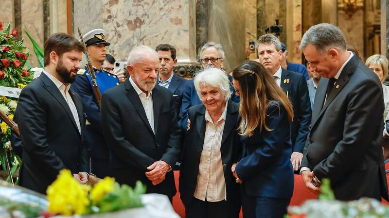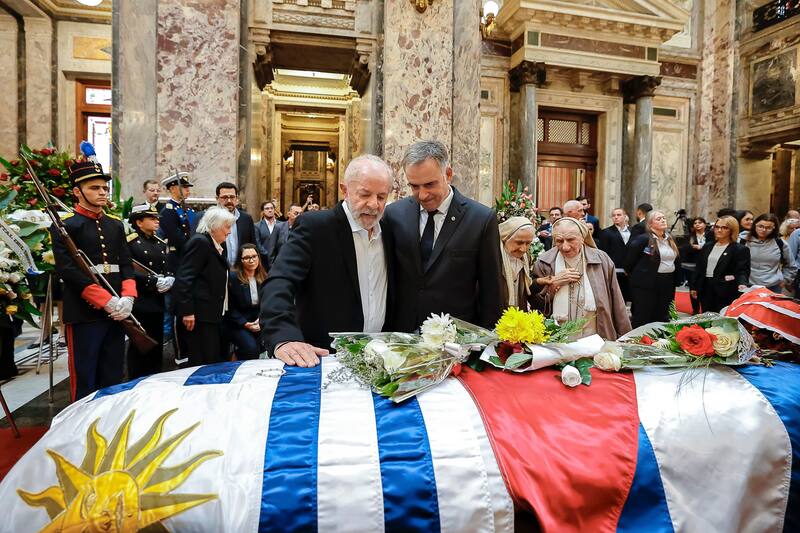 Los dos mandatarios se abrazaron con su homólogo uruguayo Yamandú Orsi y con Topolansky, antes de acercarse al ataúd en silencio. Luego se sentaron en un espacio habilitado para las personalidades políticas y familiares de Mujica.