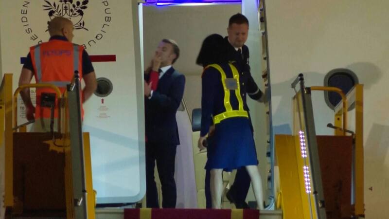 En las imágenes se ve el momento en el que se abre la puerta del avión. Detrás se ve a Macron hablando con su esposa, Brigitte --de la que solo se ven los brazos-- cuando de repente esta le empuja violentamente el rostro con ambas manos.