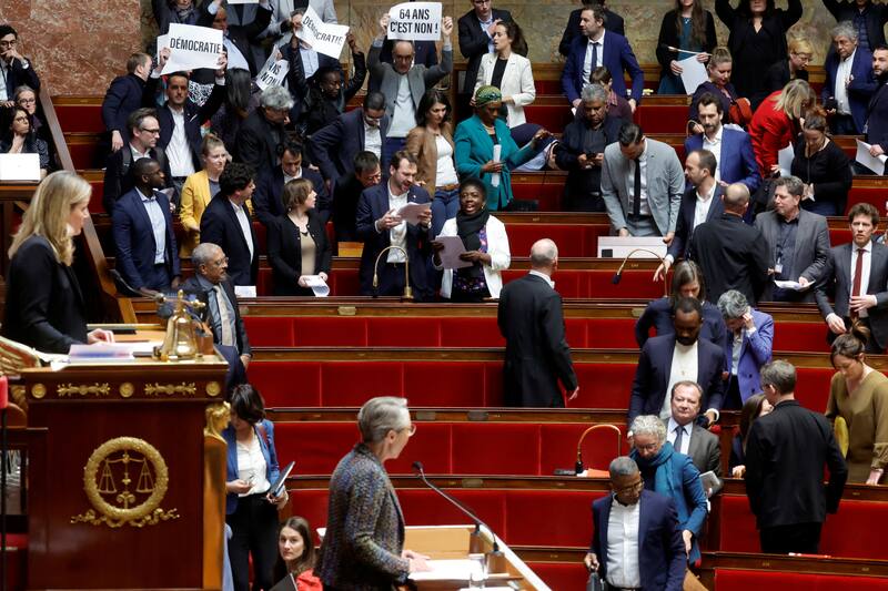 Luego de un Consejo de Ministros extraordinario, que tuvo lugar en la mañana, el gobierno francés finalmente se decidió a terminar con los debates parlamentarios sobre su reforma de pensiones, forzando a través del 49.3 la aprobación de su proyecto. Como protesta, en el mismo hemiciclo, los diputados de La Francia Insumisa sostuvieron carteles con el lema “hasta los 64, no”, refiriéndose a la edad de jubilación que propone el proyecto. Ahí mismo se pusieron a cantar La Marsellesa, obligando la suspensión por dos minutos de la sesión parlamentaria y no dejando hablar a Borne.