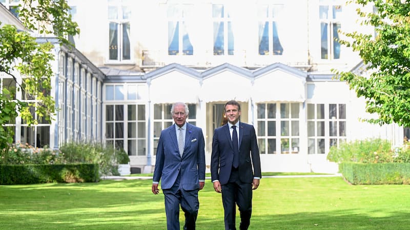 El presidente francés y su esposa fueron saludados calurosamente por el rey Carlos III y la reina Camila, poco después de haber aterrizado en la Base Aérea de Northolt, donde fueron recibidos por los príncipes de Gales.