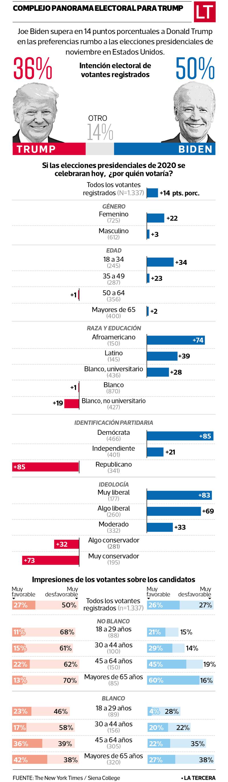 Cuatro días después del acto en Tulsa, el propio Times dio otro balde de agua fría a Trump. Una encuesta hecha por el diario y el Siena College mostró que el candidato presidencial demócrata Joe Biden aventaja por 14 puntos porcentuales al Mandatario de cara a las elecciones de noviembre. El exvicepresidente de Barack Obama registra una intención de voto de 50%, frente al 36% de Trump.