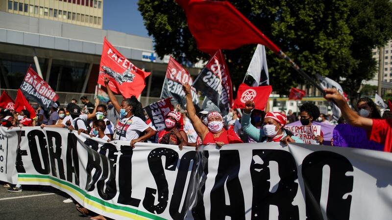 Los manifesantes, la mayoría vestidos de rojo y con máscara para prevenir el contagio del coronavirus, portaban pancartas con lemas como “Fuera corrupto criminal”, “Nadie aguanta más, “Fuera Bolsonaro” y “Las revoluciones son imposibles hasta que se vuelven inevitables”, constató la AFP.