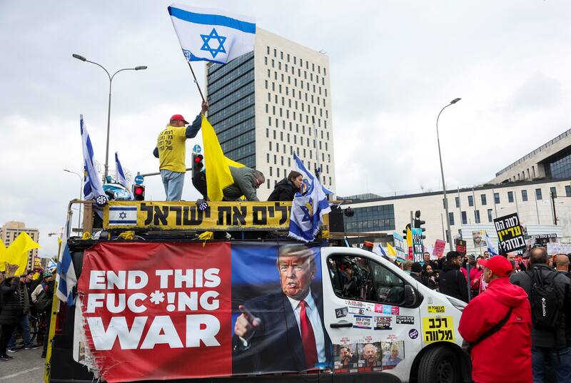 Los manifestantes que apoyaban la continuación del acuerdo bloquearon una carretera principal de Tel Aviv a Jerusalén el martes, con carteles que decían “el abandono de rehenes es un crimen de guerra”.