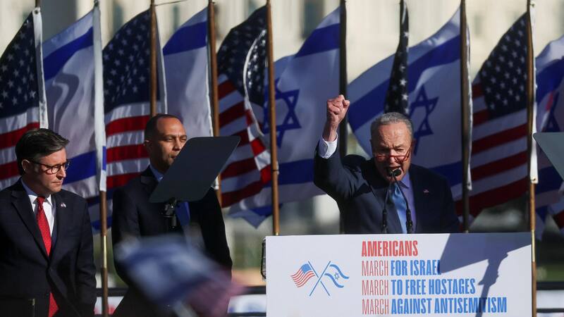 Un grupo bipartidista de congresistas estadounidenses, incluyendo el presidente de la Cámara de Representantes de Estados Unidos, Mike Johnson, y el líder de la mayoría demócrata en el Senado, Chuck Schumer, asistieron a una marcha a favor de Israel frente al Capitolio que ha congregado a miles de personas.