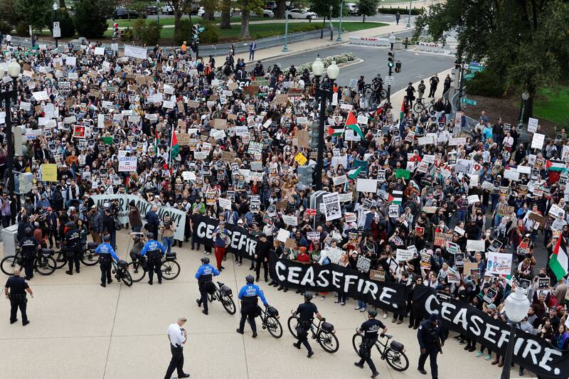 Decenas de integrantes de la organización Voz Judía por la Paz se reunieron en el lugar con pancartas, en las que pedían un cese a los ataques al enclave palestino, y exigiendo “dejar vivir a Gaza”. Otros cientos se agolparon a las afueras del edificio del Congreso. Algunas de las personas que ingresaron a las oficinas del Congreso fueron detenidas por la policía.