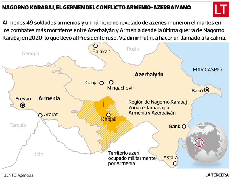 En el centro del conflicto entre estos dos países, ambos exrepúblicas soviéticas, está la región de Nagorno Karabaj, por la cual se han peleado dos guerras en los años 90 y una en 2020. La totalidad de Nagorno Karabaj queda al interior del territorio de Azerbaiyán, pero está mayoritariamente poblada por personas de etnia armenia, que ya desde antes de la disolución de la Unión Soviética alegaban para separarse de Bakú.