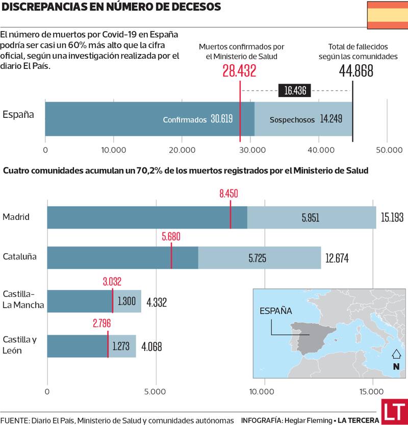 Según investigación del diario El País, con información de las 17 comunidades autónomas, el total de fallecidos por Covid-19 llegaría a 44.868. El Ministerio de Salud solo informa de 28.432.