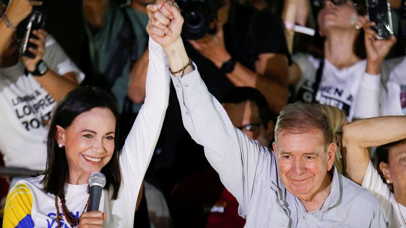 El candidato a presidencia de Venezuela, Edmundo González Urrutia y la líder opositora María Corina Machado, en el cierre de la campaña electoral este jueves, llamaron a la ciudadanía a concurrir a las urnas con la esperanza de un triunfo histórico con una “abrumadora mayoría de votos” para su coalición.