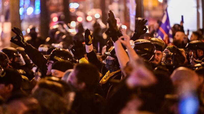 Videos publicados en las redes sociales mostraron a personas con ropa negra y amarilla y chalecos antibalas, típicos del grupo miliciano de extrema derecha Proud Boys, prendiendo fuego a los carteles el sábado por la noche.