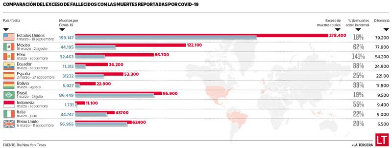 Las diferencias en los números de mortalidad son mayores en América Latina. En Perú, el exceso de muertes entre marzo y septiembre es de 86.700, cifra que le permite liderar la lista de los países estudiados por el Times con el mayor exceso de mortalidad.