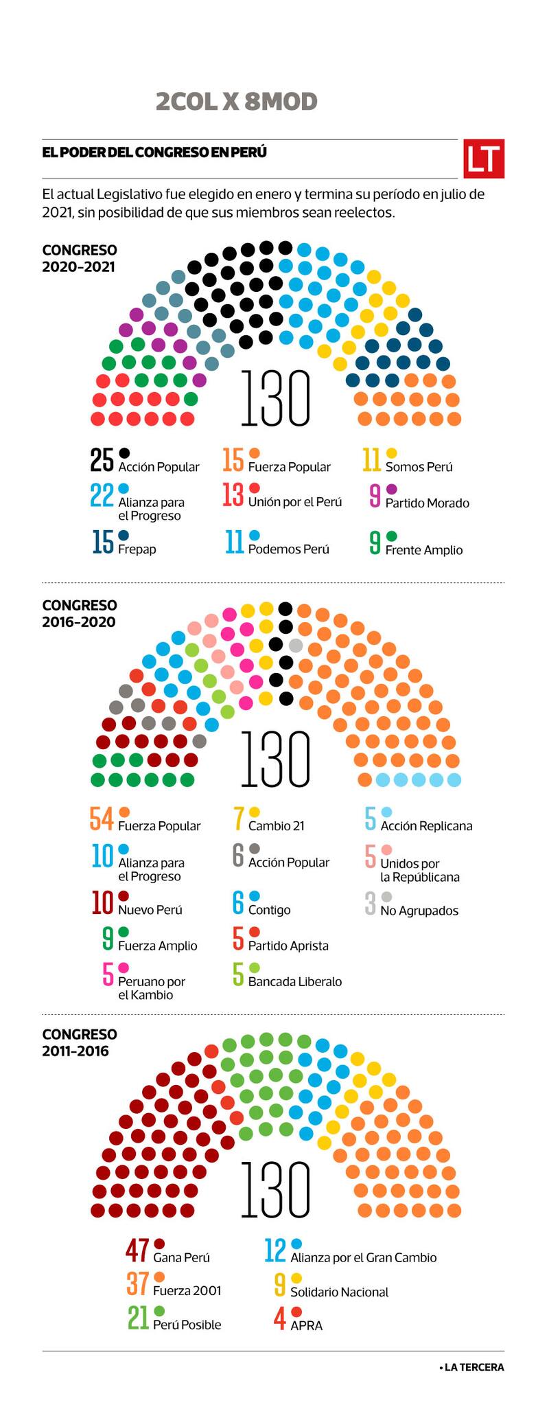 La actual crisis que vive Perú tiene su raíz en la falta de representación que viven los partidos políticos y que se arrastra desde hace décadas. Ejemplo de esto es que en el actual Congreso -que fue elegido en enero de este año- fueron 10 los grupos políticos que se repartieron los 130 escaños, sin que ninguno consiguiera la mayoría absoluta. Otra singularidad de este Legislativo es que el partido de Vizcarra no consiguió ninguna representación, por lo que su margen de maniobra era nulo. Como Vizcarra cerró el Congreso, los legisladores culminan sus funciones en julio de 2021 sin posibilidad de reelección.