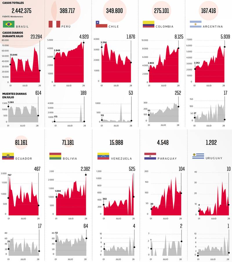 La pandemia ha golpeado con fuerza a los países que se han debatido entre el estricto confinamiento y el fuerte impacto económico. Ecuador experimentó una rápida y brutal propagación del virus durante mayo. Argentina y Perú impusieron duras cuarentenas para intentar controlar la propagación del virus. Santiago y Bogotá, en tanto, han optado por un confinamiento sectorial. Brasil ha tenido una respuesta diferenciada por estados, pero a nivel federal se ha negado al confinamiento.