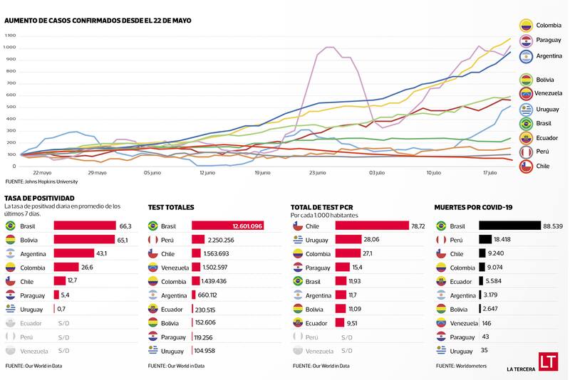 Brasil se convirtió rápidamente en el país con mayor cantidad de contagios en América del Sur, y se posiciona en segundo lugar a nivel global, solo detrás de Estados Unidos. Por otro lado, Perú, Chile, Colombia y Argentina están dentro de los 20 países con más casos totales de Covid-19.