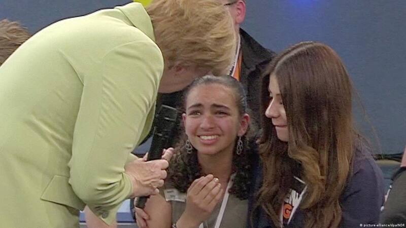 La joven se puso a llorar en un evento en julio de 2015 después de explicar en un fluido alemán que ella y su familia, que llegaron a Rostock desde un campo de refugiados libaneses, se enfrentaban a la deportación.