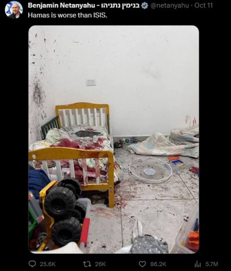 En un post anterior, Netanyahu también compartió la imagen de una cama infantil con claros rastros de sangre.