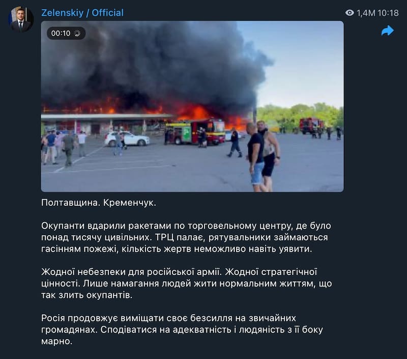 A través de Telegram, el presidente de Ucrania, Volodimir Zelensky, informó que el centro fue alcanzado por varios misiles y, como consecuencia, se ha desatado un incendio. Según información preliminar, al menos 13 personas han fallecido y 59 más han resultado heridas,