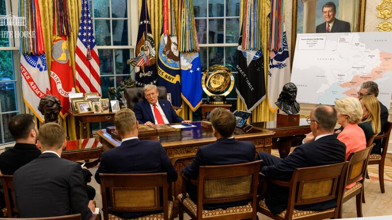 Una de las imágenes de esta reunión en el Despacho Oval muestra a Zelenski y a otros líderes europeos, como el presidente francés, Emmanuel Macron, el canciller alemán, Friedrich Merz, o el secretario general de la OTAN, Mark Rutte, entre otros, atendiendo a un Trump hablando desde su escritorio y flanqueado por un gran mapa de Ucrania con las zonas ocupadas sombreadas en rojo y con porcentajes.