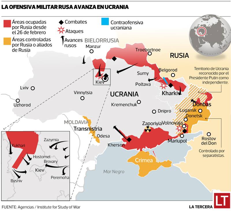 Mientras la población de la ciudad costera seguía atrapada tras el segundo fracaso del operativo de evacuación, las tropas rusas estrechaban el cerco en la región cercana a la capital ucraniana, forzando a sus habitantes a huir. La OMS denunció ataques a hospitales, y EE.UU. calificó como "muy creíbles" los informes que dan cuenta de "crímenes de guerra" cometidos por Rusia durante su invasión a Ucrania.