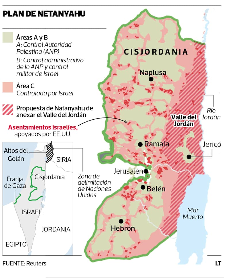 El plan de Trump se basa en la solución de dos Estados. Aunque en términos de territorio propone “el más limitado y no contiguo que jamás se les haya ofrecido a los palestinos por parte de la comunidad internacional”, explica el diario Haaretz. El principio en el que se basa este plan, según Trump, es que “ni los palestinos ni los israelíes serán sacados de sus casas”. Como resultado, el mapa que acompaña el plan permite que Israel anexe los asentamientos, así como también las áreas alrededor de los accesos a las calles.