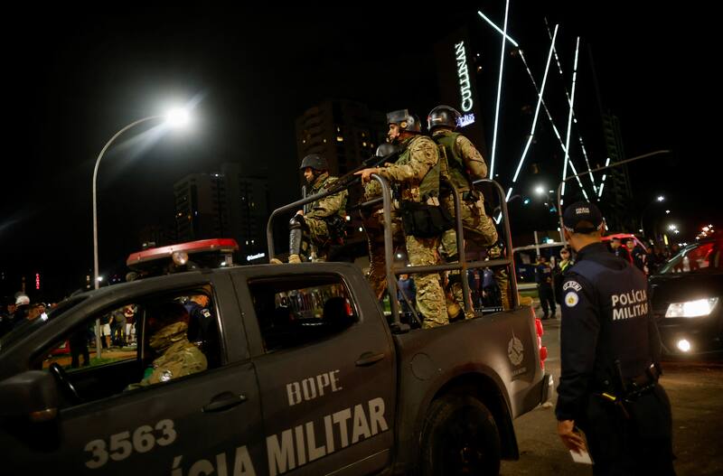 Testigos de Reuters vieron a simpatizantes de Bolsonaro, muchos con sus camisetas amarillas de fútbol o envueltos en banderas brasileñas, enfrentándose a las fuerzas de seguridad en la sede de la policía. La policía disparó granadas de aturdimiento y gases lacrimógenos para dispersar a la multitud. Los buses y automóviles cercanos fueron incendiados.