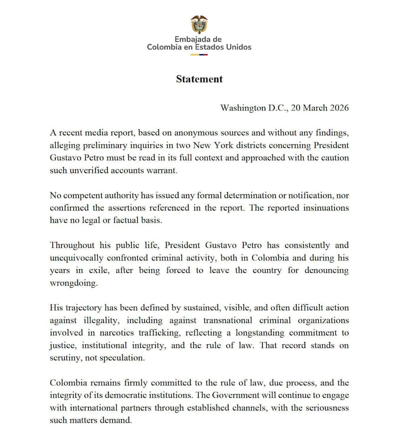 El gobierno de Colombia, por su parte, emitió un comunicado asegurando que “ninguna autoridad competente ha emitido determinación o notificación formal alguna” sobre las investigaciones contra Petro, denunciando que la información divulgada “carece de fundamento jurídico y fáctico”.