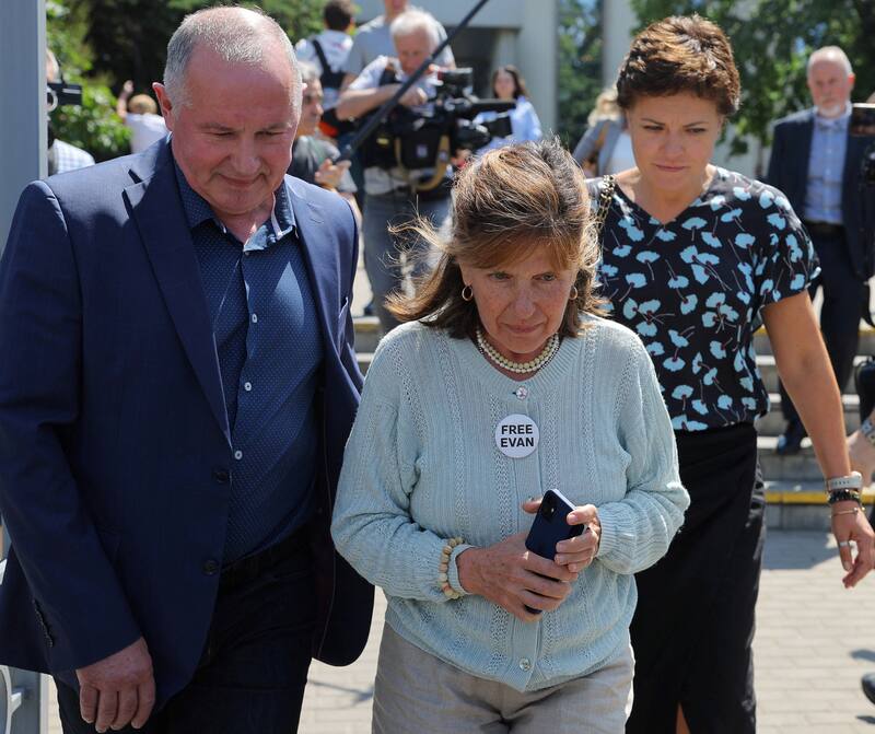 Los padres de Gershkovich, Ella Milman y Mikhail Gershkovich, estaban presentes en la sala del tribunal y se pararon junto al palco antes de la audiencia. Mientras esperaban que se anunciara el fallo, hablaron largamente con Gershkovich, quien sonrió y gesticuló mientras conversaban.