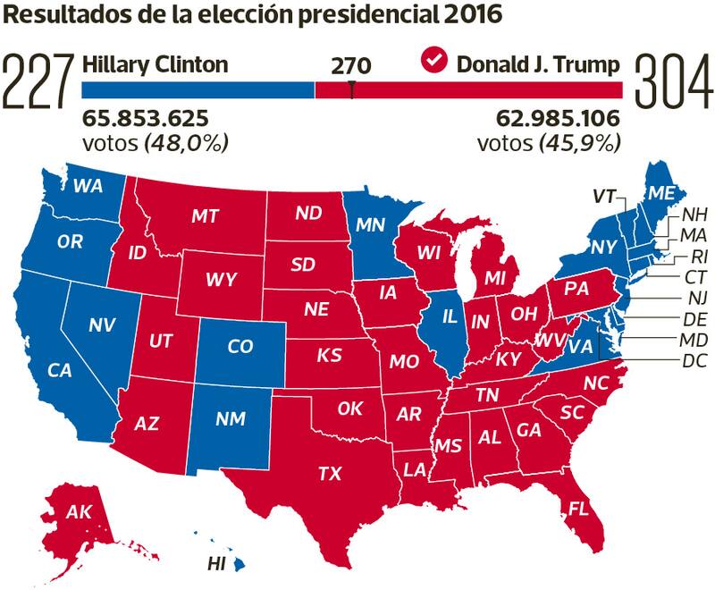 Los primeros resultados no mostraron cambios del mapa electoral de 2016. El mandatario sumaba 213 votos electorales tras imponerse en 23 estados, incluyendo Indiana, Kentucky, Oklahoma y Tennessee y Virginia Occidental. A su vez, Biden sumaba 225 votos electorales con victorias en 17 estados, incluyendo Delaware, donde jugaba de local; Nueva York, con sus 29 votos electorales, y el Distrito de Columbia, con 3 votos pero con una importancia simbólica, porque es donde está la capital estadounidense. Para conquistar la Presidencia se necesitan 270 votos en el Colegio Electoral, de un total de 538.