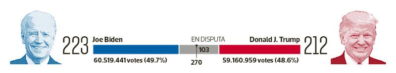 Para ganar las elecciones se necesitan 270 votos electorales, que se reparten de un total de 538 repartidos entre todos los estados de acuerdo con su representación en el Congreso. Biden tenía más margen de combinar distintas posibilidades. Así, para su victoria necesitaba Pennsylvania y otro estado del noreste industrial, como Wisconsin o Michigan. En caso de que Biden termine imponiéndose en Georgia –aunque Trump se dio como ganador en este estado–, no necesitaría Pennsylvania. En cambio, para ser reelecto Trump necesita mantener cuatro de cinco estados de los que ganó en 2016: Wisconsin, Michigan, Pennsyvania, Carolina del Norte y Georgia. De esta manera, tiene margen para perder solo uno de esos estados.