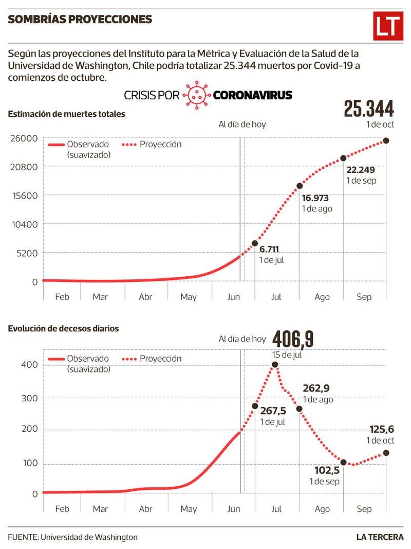 En su primera proyección para Chile, el 12 de mayo, el IHME estimaba que nuestro país tendría 687 muertes para el 4 de agosto, con un rango de 421 a 1.417. El 25 de mayo elevó a 11.970 la cifra total de decesos, con rangos de 4.050 a 31.118. Así, la tasa de mortalidad se situó en 65,78 por cada 100 mil habitantes, el índice más alto dentro de los países de Sudamérica considerados en el estudio. Según ese pronóstico, Chile registraría 236 muertes diarias del 24 al 26 de julio.