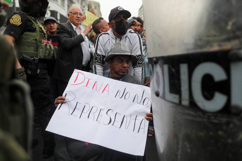 Portando banderas peruanas y al son de “El pueblo unido, jamás será vencido”, sus partidarios se congregaron en esta emblemática plaza del centro de la capital para protestar por lo que consideran ha sido una jugada de la derecha del país que no dejó gobernar a Castillo. “Lo que ha pasado nos ha chocado, nos choca lo que hace la corrupción. Desde el principio la corrupción nunca ha dejado trabajar al presidente (Castillo), porque él es una persona sencilla, humilde, pobre, es un profesor. ¿Acaso los ricos no más tienen derecho a sentarse en el sillón presidencial? Ahora lo que pasó con Dina Boluarte, esa ha traicionado al presidente, todos lo traicionaron. A los congresistas les dolió que el presidente haya cerrado el Congreso. Nosotros queremos que se cierre el Congreso y que se vayan todos los corruptos”, comenta Ana María a La Tercera, mientras sostiene un cartel que pide un cambio de Constitución.