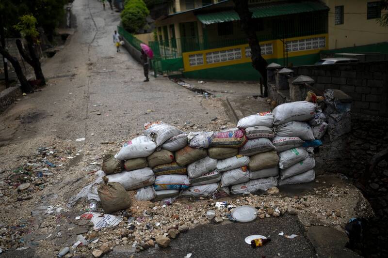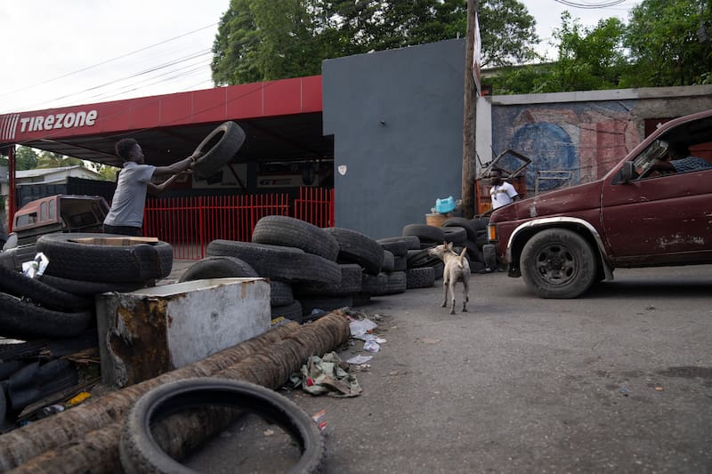 Autos viejos, neumáticos usados y alambres de púas bloquean el barrio más grande de la capital de Haití.