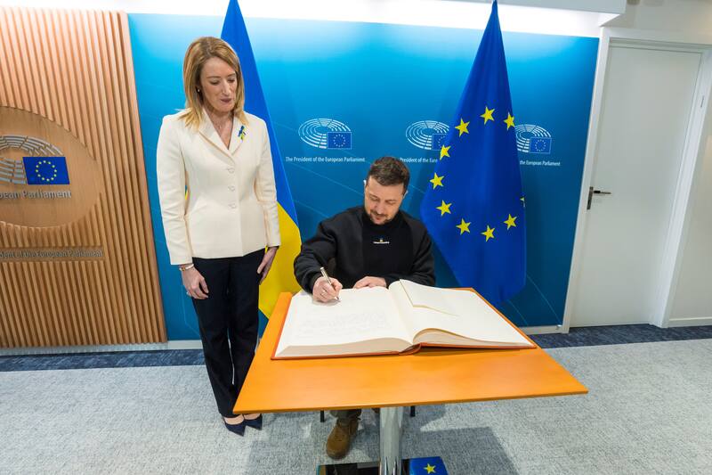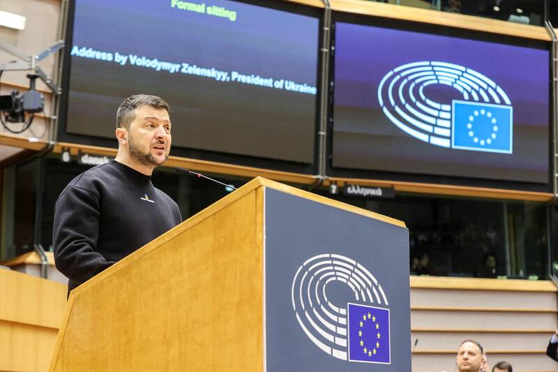 Zelensky, que realiza solo su segundo viaje fuera de Ucrania desde la invasión luego de una visita a Washington en diciembre, recibió una ovación de pie en el Parlamento Europeo por parte de los legisladores, algunos con los colores ucranianos azul y amarillo.