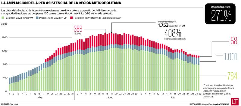 En estos cuatro meses, la capacidad de camas críticas en los hospitales y clínicas creció cuatro veces. Según la Sociedad Chilena de Medicina Intensiva (Sochimi), en enero la Región Metropolitana tenía una dotación de 430 camas con ventilación mecánica, mientras que en junio se llegó a una ocupación de 1.753, el máximo registrado, considerando las UCI y otras unidades reconvertidas.