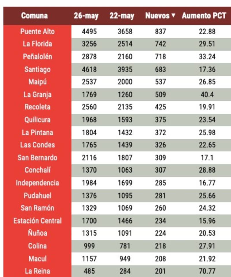 En cuanto a comunas más grandes, hay aumentos porcentuales relevantes de casos en Lampa (42,55%), La Granja (40,4%), Peñalolén (33,24%) y La Florida (29,51%).