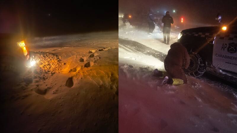 Desde Carabineros informaron que el desplazamiento se ha visto dificultado por viento blanco y bancos de nieve de entre 50 y 60 centímetros.