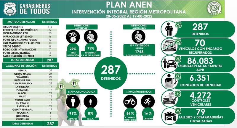 Del desglose de la cifra de detenidos se desprende que 39% de ellos mantenía orden vigente de detención, 22% por receptación de automóvil, 17% por ocultamiento de placa patente y 5% por infracción a la Ley 20.000.