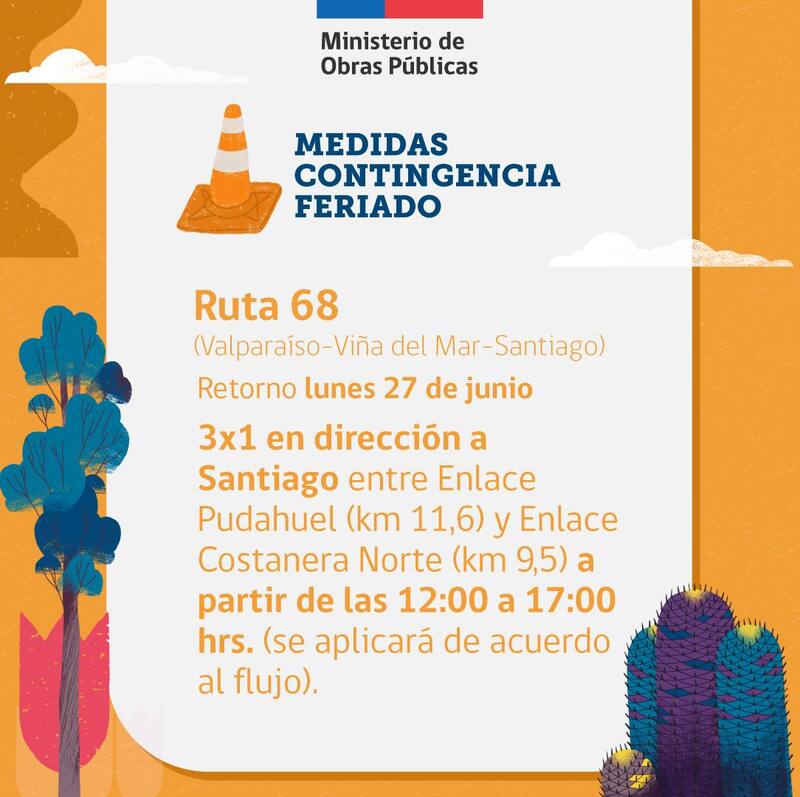- En cuanto a las medidas adoptadas para el retorno del fin de semana, para el lunes 27 de junio se contempla en las Rutas 68 y 78 la aplicación de 3x1 en dirección a Santiago.