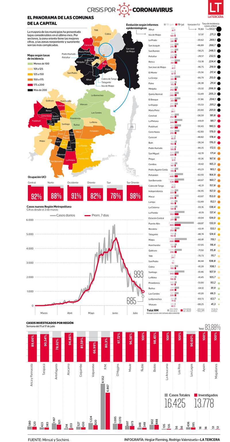 Y las cifras generales parecieran seguir mejorando. La autoridad sanitaria dio cuenta ayer de 1.656 casos nuevos en todo Chile, de los cuales 685 corresponden a la capital. Dicho indicador representa una disminución, en Santiago, de un 88% respecto de aquel peak registrado a mediados de junio. De hecho, el ministro de Salud, Enrique Paris, destacó estas cifras asegurando que son las más bajas a nivel nacional en 70 días y la menor a nivel de Santiago desde el 29 de abril (589 casos).