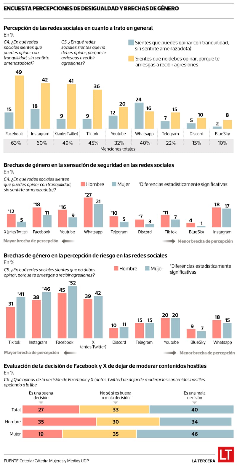 Por lo mismo, la encuesta consultó también sobre las opiniones que genera la decisión de Facebook y X de dejar de moderar los contenidos hostiles. En ese sentido, el 40% de hombres y mujeres consideró que “es una mala decisión”, mientras que el 27% opinó lo contrario y un 33% reconoció no saber. En el caso de las mujeres, el 46% evaluó de manera negativa la medida, en contraste con el 34% de los hombres que se pronunció de la misma manera.