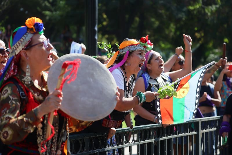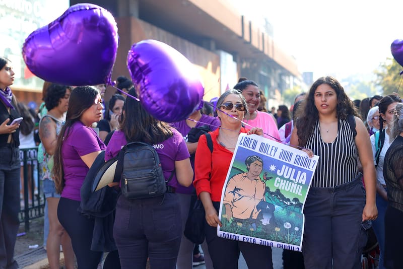 Durante la manifestación, variados carteles hacían alusión a la desaparecida activista Julia Chuñil. Fue el domingo 8 de noviembre, cuando se le perdió el rastro a la mujer. La última diligencia de Fiscalía se llevó a cabo el jueves 30 de enero, cuando carabineros de la Segunda Comisaría de Los Lagos llegaron hasta el sector de Huichaco Sur, en la comuna de Máfil, para efectuar una entrada y registro en la casa de Julia Chuñil.