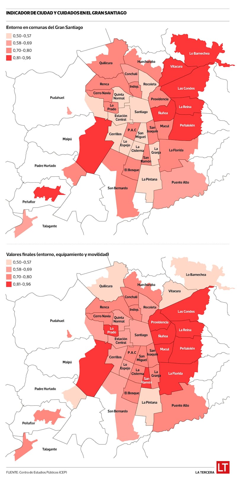 También se establecieron valores para las comunas del Gran Santiago. En cuanto a movilidad, Providencia, Ñuñoa, Las Condes, Peñalolén y Conchalí registran los mejores valores, mientras que La Pintana y Pedro Aguirre Cerda tienen los peores índices. Si se analiza el entorno, es decir la seguridad y la percepción del espacio público, las comunas más débiles son Santiago, Recoleta, Estación Central y La Pintana. En este aspecto también hay brechas de género: solo el 21% de las mujeres se siente segura al caminar por la calle en las noches, mientras que el 35% de los hombres afirma sentirse seguro en las mismas condiciones, según la encuesta de percepción calidad de vida urbana elaborada por el Minvu.