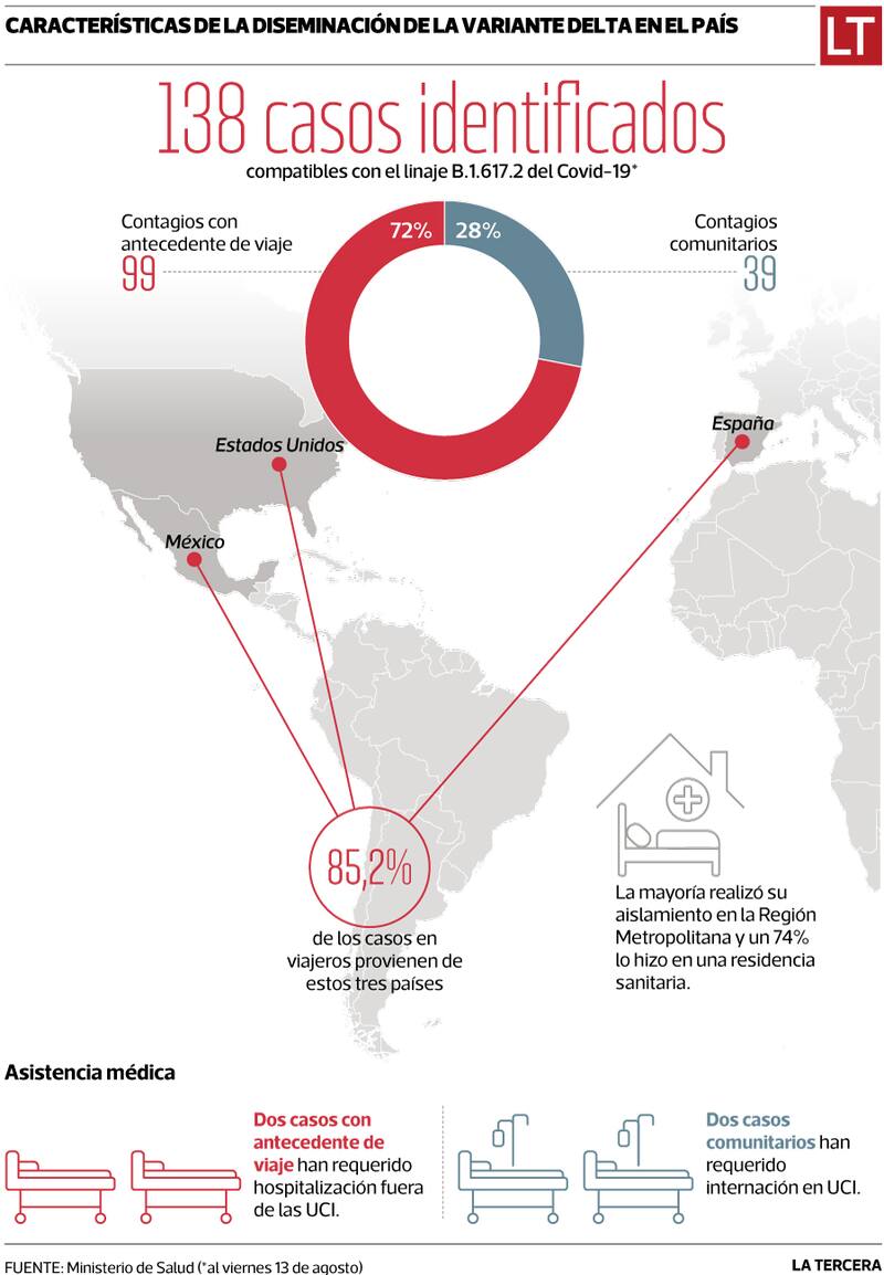 En un período de apenas siete semanas desde que se reportó el primer caso de la temida variante delta, Salud -hasta el pasado viernes- ya contaba 138 casos compatibles con este linaje del virus: 99 de ellos en viajeros, y otros 39 de transmisión comunitaria. Estos últimos casos son de mayor preocupación, pues tras la investigación epidemiológica, estos han quedado calificados como sin nexo epidemiológico con un caso índice o contacto estrecho (ver infografía).