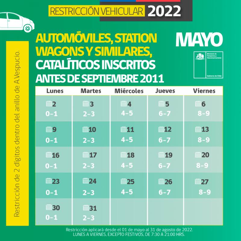 - Desde el 1 de mayo y hasta el 31 de agosto (Gestión de Episodios Críticos) se aplicará la restricción vehicular 2022, que aplica la restricción permanente a los vehículos con sello verde (catalíticos) con fecha de inscripción anterior a septiembre de 2011.