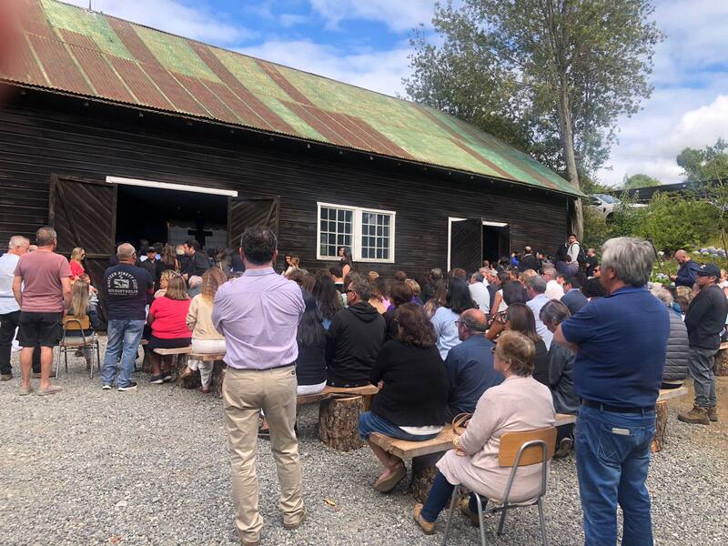 Mientras la prensa estaba pendiente de conversar con la familia, José Cox y su señora, Loreto Alcaíno -los dueños de la casa desde donde el 6 de febrero del año pasado despegó Piñera en su helicóptero antes de caer al lago; Ignacio Guerrero y su hijo Bautista -quienes estaba esa tarde abordo en del Robinson R44-; Carlos Alberto “Choclo” Délano y su esposa Verónica Méndez y María Cecilia Guzmán, entre otros, ingresaron al viejo galpón -adecuado hace 2 años como capilla- y se sentaron en la segunda banca detrás de la familia.